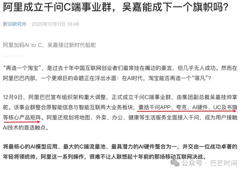 说实话:能在大厂这么一个赛马+宫斗的地方搞出业界最顶流的开源模型,千问是有技术水平的!同时,还有消息称:阿里成立千问C端事业群,消息如下: