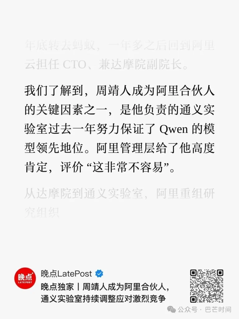 (真是风水轮流转啊……最近刚好有一堆消息(也是一堆好消息),说是负责千问系列的老大——周靖人升职为阿里合伙人。